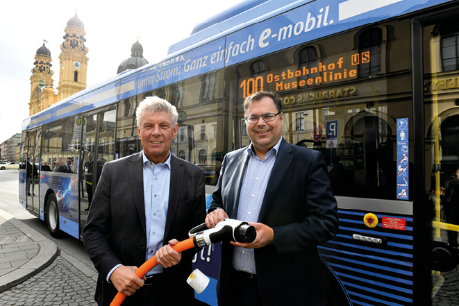 Münchens Oberbürgermeister Dieter Reiter (li.) und Ingo Wortmann, Vorsitzender der Geschäftsführung der Münchner Verkehrsgesellschaft mbH (MVG) bei der Vorstellung der E-Bus-Linie 100 Anfang 2019, die sukzessive bis 2020 umgesetzt wird (Bild: SWM/MVG).
