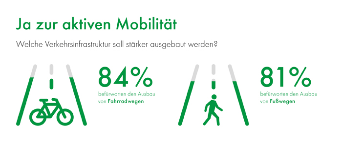 . Für 62 Prozent gehört ein eigenes Auto zum Leben dazu. Geht es um den Ausbau von Verkehrsinfrastruktur wie Straßen, Fahrrad- und Fußwege befürworten dies mehr als drei Viertel der Befragten. Besonders stark wünschen sich die Deutschen den Ausbau für die aktive Mobilität – Fahrradwege (84 Prozent) und Fußwege (81 Prozent).