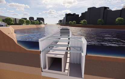 Der Waisentunnel verläuft zu einem Teil unter der Spree hindurch. Die besondere Herausforderung für die Expert*innen der BVG und deren Projektgesellschaft besteht darin, den Ersatzneubau zu errichten und an gleicher Stelle den Schiffsverkehr aufrecht zu erhalten. Zunächst wird dieser Abschnitt mithilfe von Stahlbetonschotten vom restlichen U-Bahnnetz abgetrennt, um das Eindringen von Wasser zu verhindern. Danach wird das bestehende Bauwerk zurückgebaut. Der anschließende Ersatzneubau erfolgt in zwei Phasen: Zuerst werden auf der südlichen Spreeseite Spundwände und eine Sohle eingebracht und die Baugrube ausgepumpt. So können die Bautrupps in einer trockenen Baugrube die erste Hälfte des Ersatzneubaus errichten. Im Anschluss wird die Baugrube wieder geflutet und die Spundwände werden auf die nördliche Seite umgesetzt, damit sich die Arbeitsschritte dort wiederholen können. Auf diese Weise entsteht Schritt für Schritt ein vollständiger neuer Tunnel.
