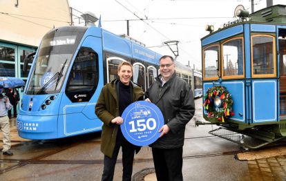 Als Jubiläums-Tram sind zwei Züge der neuesten Fahrzeuggeneration „Avenio TZ 4“ gestaltet. Die erste Tram wird ab Mittwoch, 25. Februar, im regulären Linienverkehr eingesetzt, bevorzugt auf den Linien 16, 17, 19, 21 und 27. Der vorderste Teil ist dem historischen A-Wagen von 1898 nachempfunden, dessen mittiges Spitzenlicht zwischen den modernen Scheinwerfern nachgebildet ist – sogar die in einigen Trams früher zu findenden Vorhänge an den Fenstern wurden angedeutet.