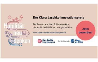 Innovative Frauen aus der Bahnbranche können sich ab sofort wieder um den Clara Jaschke Preis der Allianz pro Schiene bewerben. Seit 2018 zeichnet das Verkehrsbündnis Frauen aus, die mit ihrem Erfindergeist Mobilität neu und nachhaltig denken und die Verkehrswende vorantreiben. Bewerbungsfrist ist der 30. Juni 2023. Bereits zum sechsten Mal sucht die Allianz pro Schiene nach erfinderischen Eisenbahnerinnen. Startschuss für die Bewerbung ist traditionell der Weltfrauentag am 8. März.