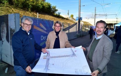 Oberbürgermeisterin Eva Weber, Baureferent Steffen Kercher (rechts) und swa-Geschäftsführer Rainer Nauerz stellen die Pläne für die Fertigstellung von Hauptbahnhof und Lückenschluss vor (Foto: SWA).